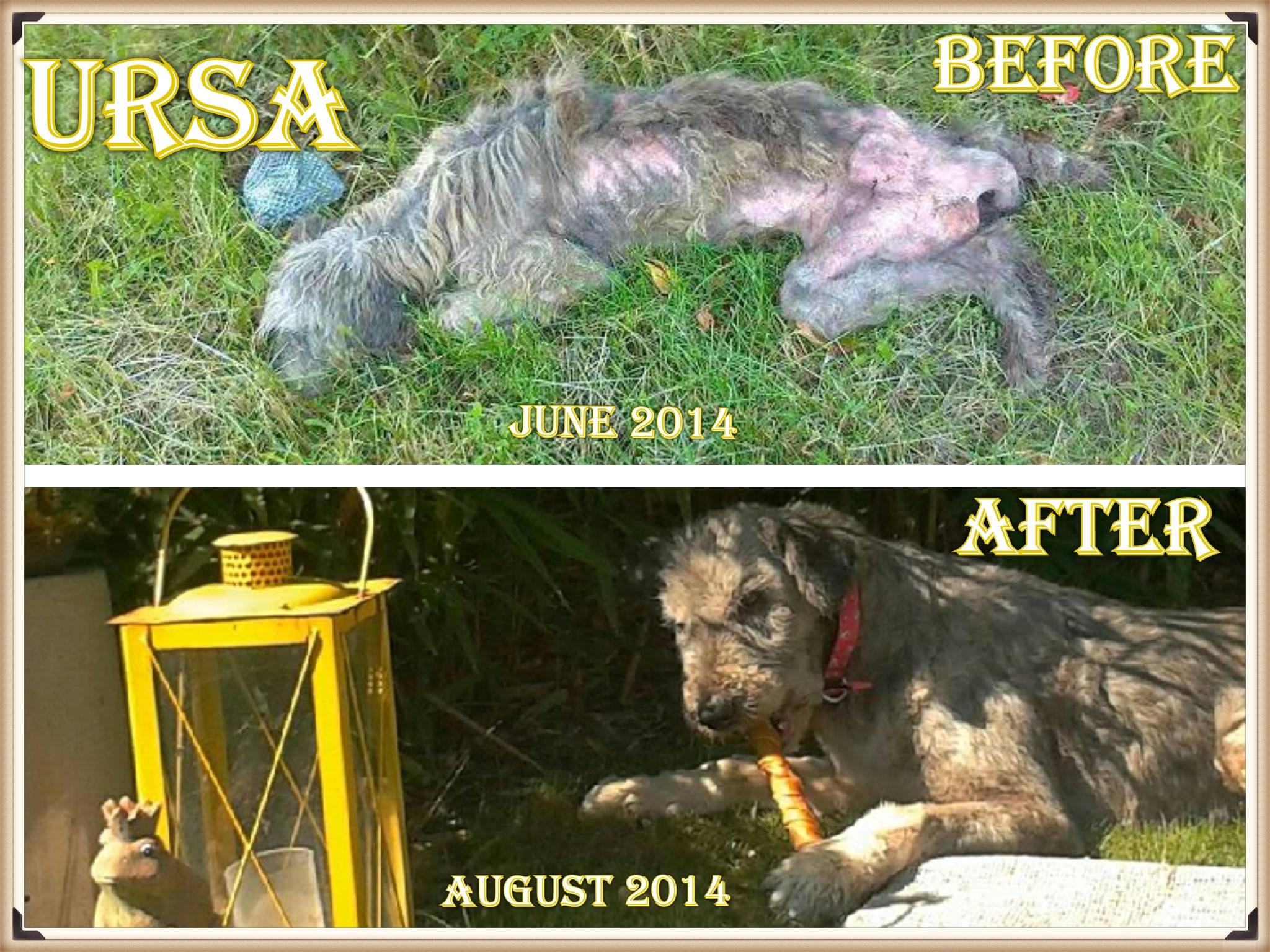 Last month I wrote about Ursa, a poor dog who was so malnourished she could not stand and she had to be carried to safety back in June. She was nothing but skin and bones, with sores where the skin was taught across her bones. She was in a heart wrenching state.